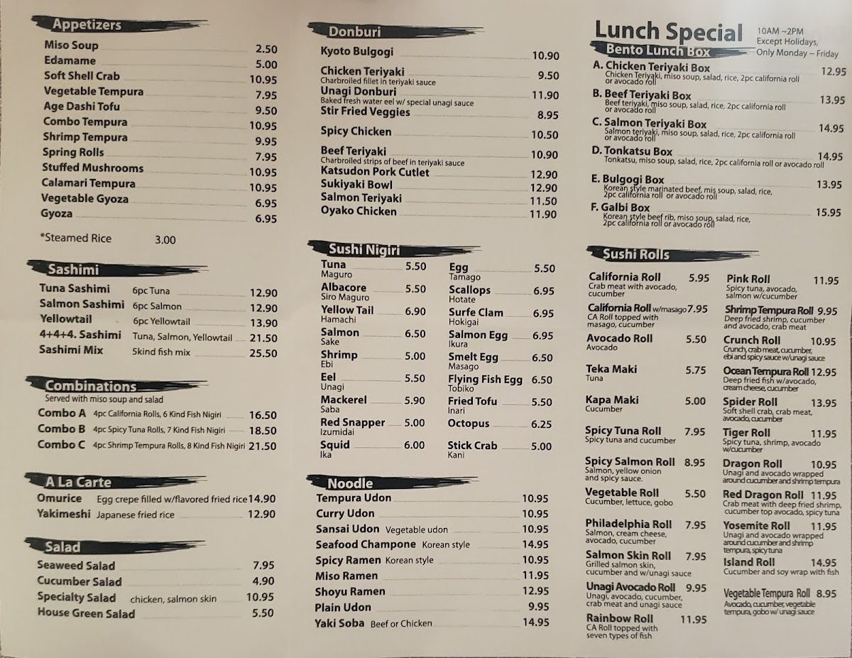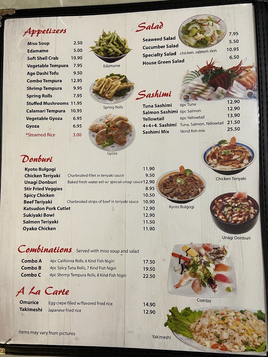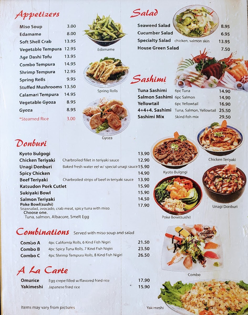 Kyoto Kafe offers a diverse and flavorful menu, perfect for those craving a variety of Japanese dishes. The appetizers feature comforting options like Miso Soup, Edamame, and Soft Shell Crab. For heartier dishes, the Donburi section includes tasty choices like Kyoto Bulgogi and Chicken Teriyaki, while the Combinations menu offers convenient mix-and-match options with Combo A, Combo B, and Combo C. A La Carte items include the delightful Omurice and Yakimeshi. The salad options, such as Seaweed Salad and Cucumber Salad, provide fresh, light choices to balance out the rich flavors of the main dishes. Sushi enthusiasts will enjoy the Tuna Sashimi, Salmon Sashimi, and variety of Sushi Nigiri, with classics like Tuna, Yellowtail, and Shrimp. Noodles are well represented with Tempura Udon, Curry Udon, and the unique Seafood Champone. For those with a craving for sushi rolls, the menu features popular rolls like the California Roll, Teka Maki, and the simple yet satisfying Avocado Roll. The dinner plates are a great way to enjoy a fulfilling meal, with choices like Beef Teriyaki, Shrimp Tempura Plate, and Katsu Curry. To complement the meal, there are refreshing beverages such as Hot Tea, Ramune, and a selection of beers like Heineken and Budweiser. For dessert, you can end your meal on a sweet note with Green Tea Ice Cream or Red Bean Ice Cream. Whether you're in the mood for a simple meal or something more elaborate, Kyoto Kafe’s menu provides an array of options sure to satisfy every taste.