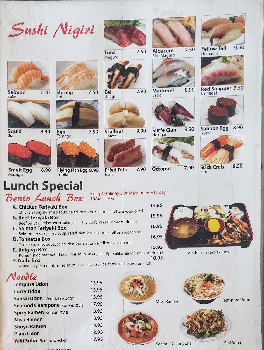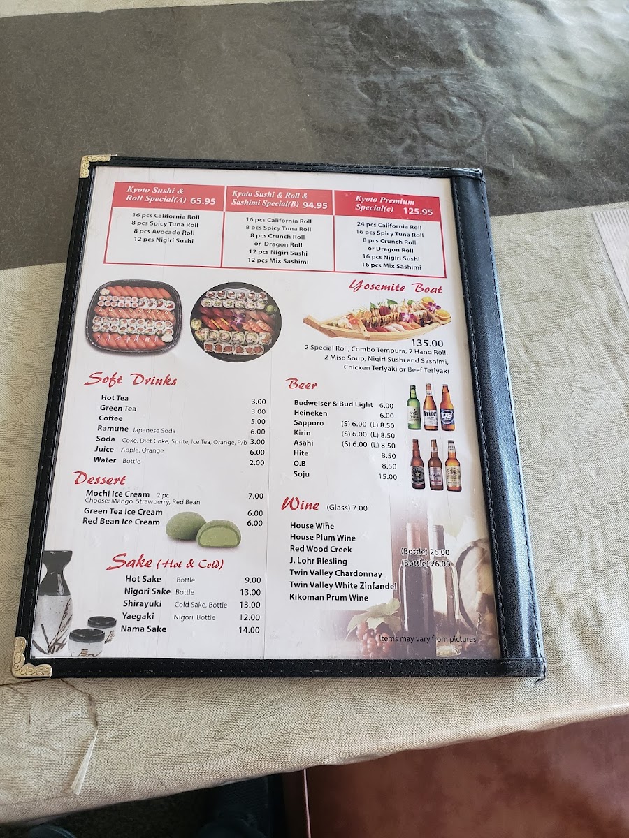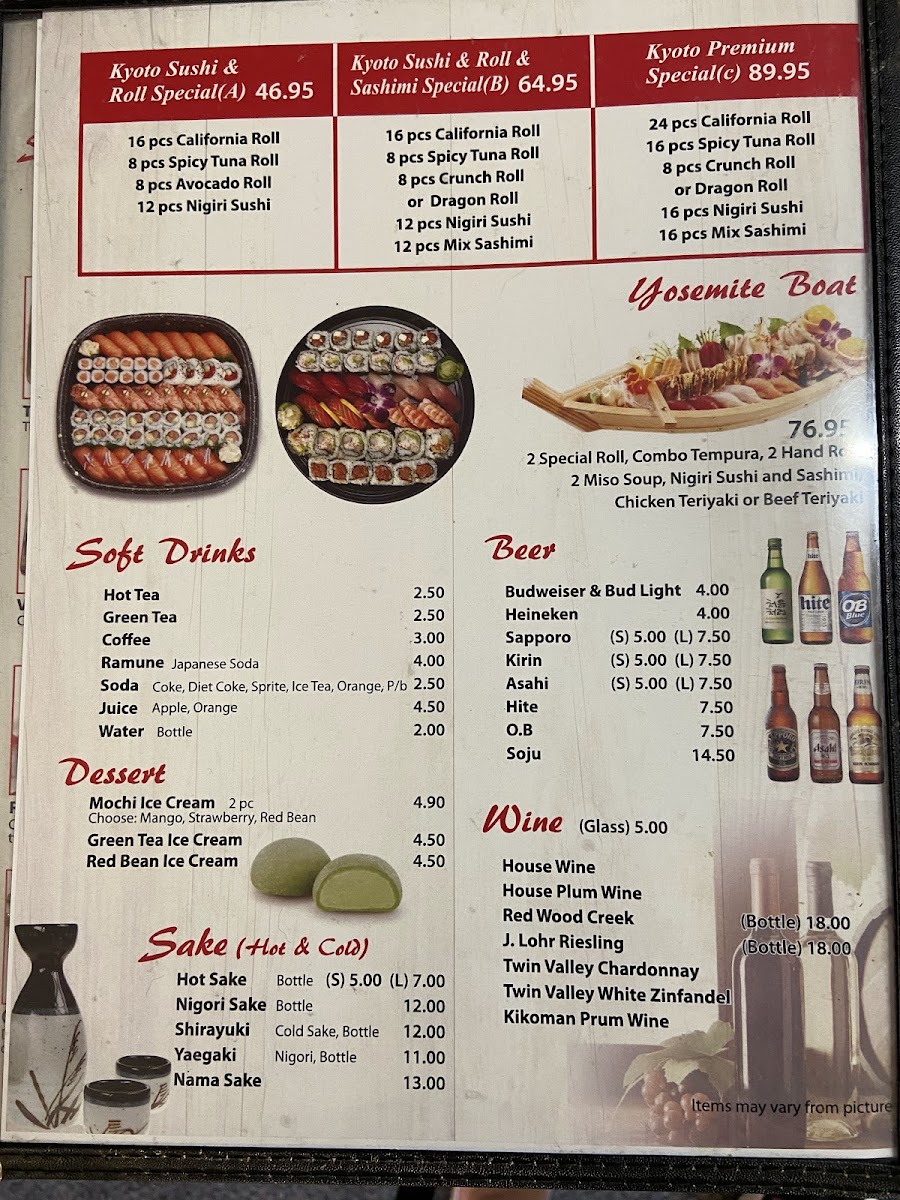 Kyoto Kafe offers a diverse and flavorful menu, perfect for those craving a variety of Japanese dishes. The appetizers feature comforting options like Miso Soup, Edamame, and Soft Shell Crab. For heartier dishes, the Donburi section includes tasty choices like Kyoto Bulgogi and Chicken Teriyaki, while the Combinations menu offers convenient mix-and-match options with Combo A, Combo B, and Combo C. A La Carte items include the delightful Omurice and Yakimeshi. The salad options, such as Seaweed Salad and Cucumber Salad, provide fresh, light choices to balance out the rich flavors of the main dishes. Sushi enthusiasts will enjoy the Tuna Sashimi, Salmon Sashimi, and variety of Sushi Nigiri, with classics like Tuna, Yellowtail, and Shrimp. Noodles are well represented with Tempura Udon, Curry Udon, and the unique Seafood Champone. For those with a craving for sushi rolls, the menu features popular rolls like the California Roll, Teka Maki, and the simple yet satisfying Avocado Roll. The dinner plates are a great way to enjoy a fulfilling meal, with choices like Beef Teriyaki, Shrimp Tempura Plate, and Katsu Curry. To complement the meal, there are refreshing beverages such as Hot Tea, Ramune, and a selection of beers like Heineken and Budweiser. For dessert, you can end your meal on a sweet note with Green Tea Ice Cream or Red Bean Ice Cream. Whether you're in the mood for a simple meal or something more elaborate, Kyoto Kafe’s menu provides an array of options sure to satisfy every taste.